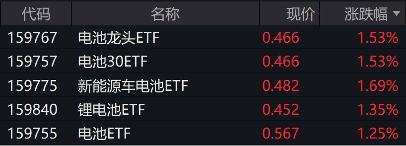 受盘面影响,跟踪国证新能源车电池指数的ETF普涨逾1%。